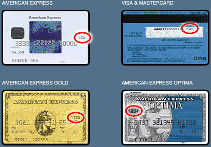 The CVV code is a three- or four-digit number printed on the back of VISA and MasterCard credit cards and on the front of American Express credit cards, as indicated by the red circles below.